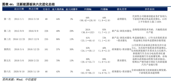 泛新能源板块行情在进化阶段共经历了六次进化,时间在2-8个月不等。