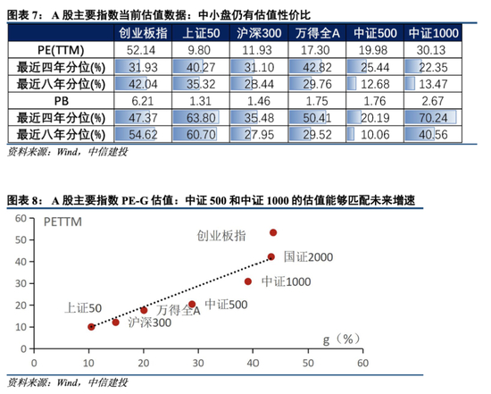 中小盘风格持续一年半后,估值仍有性价比。由于大小盘风格四年一次轮动,因此我们对比了A股主要指数估值的近四年分位和近八年分位水平。(由于国证2000从成立起仅有1400只成份股,直到2018年2月指数成份才达到2000个,相对于其他指数而言成份股变动过于巨大,故对比其估值的历史分位意义不大,故未将其纳入讨论中。)从市盈率的角度来看,中小盘风格在强势了一年后,中证500和中证1000为代表的中小盘估值分位数依然处于极低位置,远低于大盘指数估值水平;从市净率的角度来看,中小盘指数的PB八年分位低于创业板指和上证50。整体来看中小盘的估值性价比仍然是较好的。另外PE-G估值法结果也证明中小盘的当前的估值是匹配其未来的增速的,从估值的角度看,中小盘风格的安全边际依然存在。