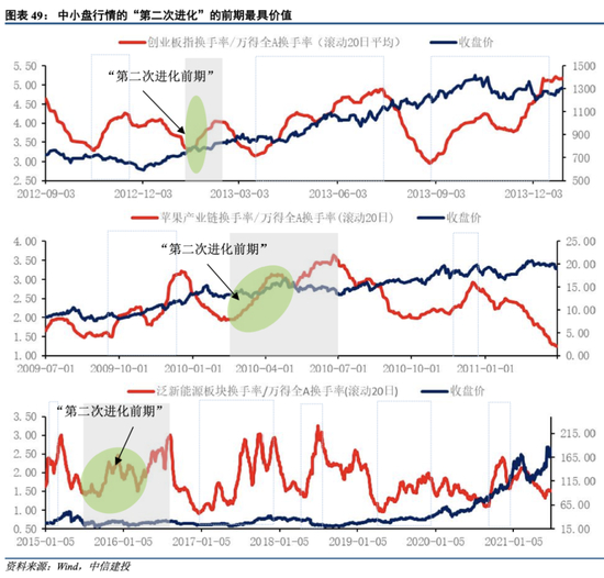 中小盘行情拐点可用换手率比来观测。在复盘过程中,我们发现进化阶段换手率比高点会领先行情高点:创业板出现四次领先,平均领先31个交易日;苹果产业链出现三次领先,平均领先55个交易日;泛新能源板块出现六次领先,平均领先53个交易日。因此换手率比高点可以用来观测行情的拐点。