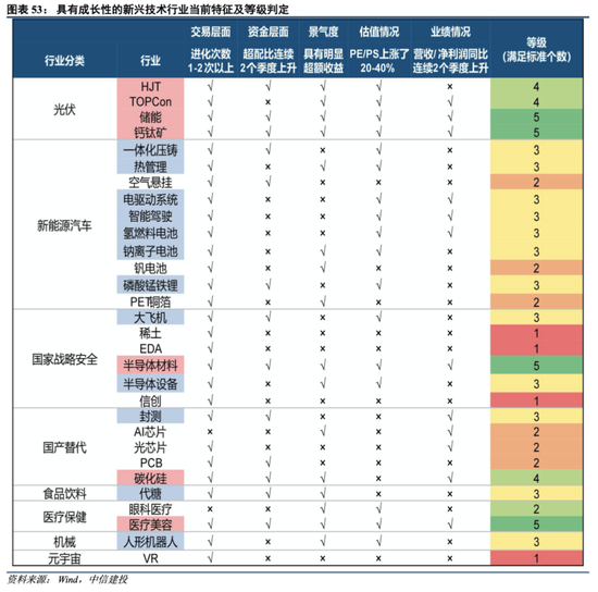 均衡配置成长行业,重点关注具有进化前景的新兴技术行业。我们根据行业是否满足五大指标具有进化基因,对其进行等级判定,符合一个标准获得一分,对全市场具备成长逻辑的细分景气中小盘按照进化基因的特征划分为五档。值得重点关注的细分子行业有:光伏、新能源汽车、国家战略安全相关、国产替代相关、医疗保健、代糖、人形机器人、元宇宙等具有进化前景的新兴技术行业。细分子行业中获得等级四档以上的有:储能、钙钛矿、医疗美容、半导体材料、TOPCon电池、HJT电池、碳化硅。