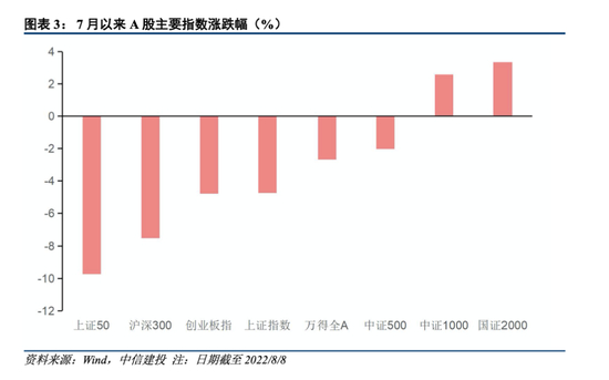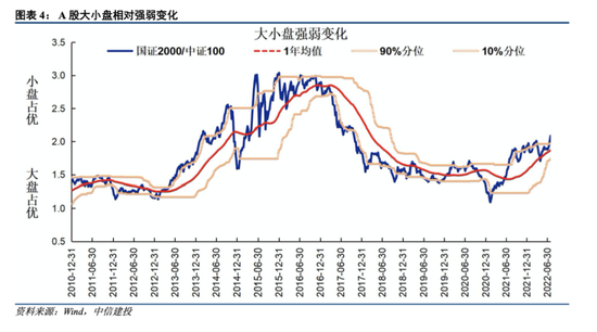 当前市场表现中小盘占优。我们从2022年年初、4月26日市场见底进入反弹阶段、7月市场走弱三个时间节点至今复盘当前的中小盘行情,三个阶段中小盘表现都显著优于大盘,表现在今年以来中小盘跌幅更小,市场开始反弹后中小盘力度更大;尤其是7月以来中小盘与大盘表现出现分化,市场整体走弱阶段中小盘逆势上涨;整体来看,中小盘的表现强于大盘,当前市场风格中小盘占优。