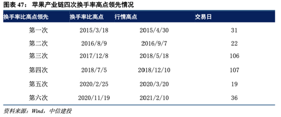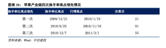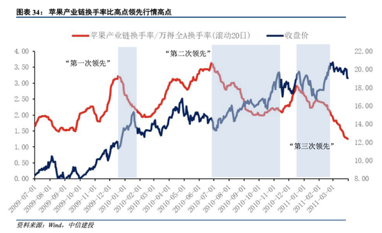 苹果产业链行情三次换手率高点领先行情高点具体情况: