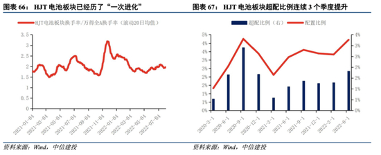 HJT电池板块相比万得全A有明显超额收益,目前估值相比4月最低点26倍已上升至39倍左右,但需继续追踪投产和业绩兑现情况。