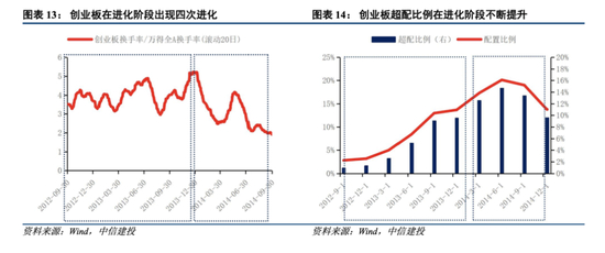 对创业板指行情进行复盘,按照指标我们发现2012年Q3-2013年Q4正是创业板的进化阶段。创业板成分股不断增加,以互联网、计算机、传媒、生物医药、电子等行业为主,在进化阶段,市场对创业板从发掘到认知逐渐加深,经历了4次进化,资金参与度逐渐提高,基金逐季度稳定增配,超配比例不断增加。随着市场对其认知大幅提升,资产配置也逐渐到位,交易活跃度中枢下移,创业板行情也进入了下一个转换阶段。