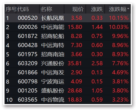 今日市场表现突出的还有受到海外消息扰动的海运板块。截至收盘,Wind海运指数大涨逾4%,长航凤凰、中远海能、招商轮船纷纷涨停,招商南油、中远海特涨近9%,中远海发、宁波海运等涨逾3%,有“周期之王”之称的中远海控涨近1%。