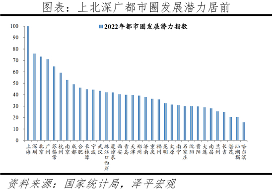 在都市圈层面,34个千万级都市圈以18.6%的土地集聚63%的人口创造约78%的GDP,其中上海、深圳、北京、广州等都市圈发展潜力居前。鉴于当前多数城市群发育不成熟,且部分核心城市生产要素明显向周边溢出,中央把以大城市为核心的都市圈作为城市群建设的突破口和抓手。2019年2月,国家发改委发布《关于培育发展现代化都市圈的指导意见》,这是中国第一份以“都市圈”为主题的中央文件,要求以大城市及周边地区同城化为方向推进基础设施一体化、强化城市间产业分工协作、加快建设统一开放市场、推进公共服务共建共享等,包括以轨道交通等为基础打造1小时通勤圈。根据有关城市群规划及相关地方规划,当前中国有上海、广州、深圳等10个3000万人以上的大都市圈,有合肥、成都、杭州等11个2000-3000万人大都市圈,有西安、宁波等13个1000-2000万人大都市圈。34个千万级都市圈以18.6%的土地集聚63%的人口创造约78%的GDP。从发展潜力看,上海、深圳、北京、广州都市圈发展潜力居前,之后是苏锡常、杭州、南京、成都、合肥、长株潭都市圈,其中长三角的6个都市圈中仅宁波都市圈未进前10。深圳、上海、广州、成都都市圈近五年人口增长领跑全国,除上海都市圈外均主要由中心城市贡献。