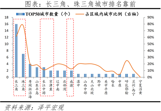 3)分城市群看,发展潜力TOP50城中五大城市群内部城市共30个,占比60%。“十四五”规划提出,我国要发展壮大城市群和都市圈,分类引导大中小城市发展方向和建设重点,并提出要优化提升京津冀、长三角、珠三角、成渝、长江中游五大城市群。在发展潜力TOP50城中长三角、珠三角、京津冀、长江中游、成渝城市群内城市数量分别为16、7、2、3、2个,占区域城市总量比例分别为61.5%、77.8%、15.4%、11.1%、12.5%,长三角、珠三角城市群起步较早,发展相对成熟,资源集聚能力较强,区域城市总体排名靠前。
