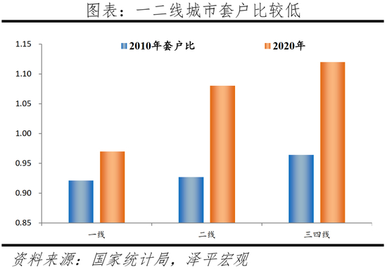 当前一二线住房供给偏紧,套户比分别为0.97、1.08,中部和东北地区相对过剩,套户比分别为1.10、1.13。我们在《中国住房存量报告2021》估算了2020年各省级、地级单位城镇住宅套户比。分线看,2020年一线、二线、三四线城镇人均住房建筑面积分别为26.4、34.6、37平米;套户比分别为0.97、1.08、1.12。分地区看,2020年东部、中部、西部、东北地区城镇人均住房建筑面积分别为32.4、37.6、34.3、29.8平;套户比分别为1.01、1.10、1.08、1.13。在全国336个地级及以上单位(不含三沙)中,2020年有22个城市的套户比小于1,占比6.5%;有121个城市的套户比介于1.0-1.1之间,占比36%;有133个城市的套户比介于1.1-1.2之间,占比39.6%;有60个城市的套户比高于1.2,占比17.9%。分城市看,一二线城市中套户比小于1的城市分别为合肥、上海、重庆、广州、佛山、东莞、深圳、北京、天津,整体供应较少。