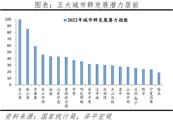 以中心城市为引领的都市圈城市群更具生产效率,更节约土地、能源,是支撑中国经济高质量发展的主要平台,是中国当前以及未来发展的重点。在城市群层面,19个城市群的核心在于京津冀、长三角、珠三角、长江中游、成渝5个城市群。“十四五”规划提出要优化提升京津冀、长三角、珠三角、成渝、长江中游五大城市群;发展壮大山东半岛、粤闽浙沿海、中原、关中平原、北部湾等城市群;培育发展哈长、辽中南、山西中部、黔中、滇中、呼包鄂榆、兰州-西宁、宁夏沿黄、天山北坡等城市群。其中,五大城市群以全国13%的土地集聚了47.8%的人口,创造了60.3%的GDP,成为带动中国经济高质量发展的主要平台。从发展潜力排名结果看,长三角、珠三角房地产投资潜力指数遥遥领先,其次是京津冀、长江中游、成渝城市群,之后是山东半岛、粤闽浙沿海、中原等城市群。