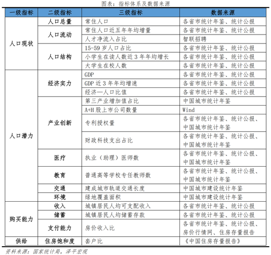 研究背景和分析框架:1)研究背景:我国进入都市圈城市群时代,区域分化。房地产发展有明显的阶段特征:从高速增长期到平稳或下降期、从数量扩张期到质量提升期、从总量扩张期到“总量放缓、结构分化”期。总体看,中国20-50岁人口于2013年见顶、需求峰值已过,存量住房套户比近1.1和房地产长效机制加快构建,标志着中国房地产市场告别高增长阶段,进入高质量发展的新时代新周期。分区域看,中国进入城市群都市圈时代,区域分化突出,城市发展潜力差异较大,城市研究价值更加凸显。预计未来中国约80%的新增城镇人口将分布在19个城市群,其中约60%将分布在长三角、珠三角等七大城市群,随着人口继续分化,房地产投资潜力差异也将持续显现。2)分析框架:人随产业走,人往高处走。研判城市发展潜力的关键在于研判人口趋势,逻辑链条是:一,房地产长期看人口,人口决定需求;二,产业决定城市兴衰,产业兴则城市兴,产业聚则人口聚;三,产业布局取决于区位,区位取决于规模经济和交通成本。基于上述逻辑,我们从“需求+供给”两个层面建立基本面分析框架,研究中国300余个地级及以上城市(不含港澳台)发展潜力,具体选取了21个比较有代表性的指标进行分析。