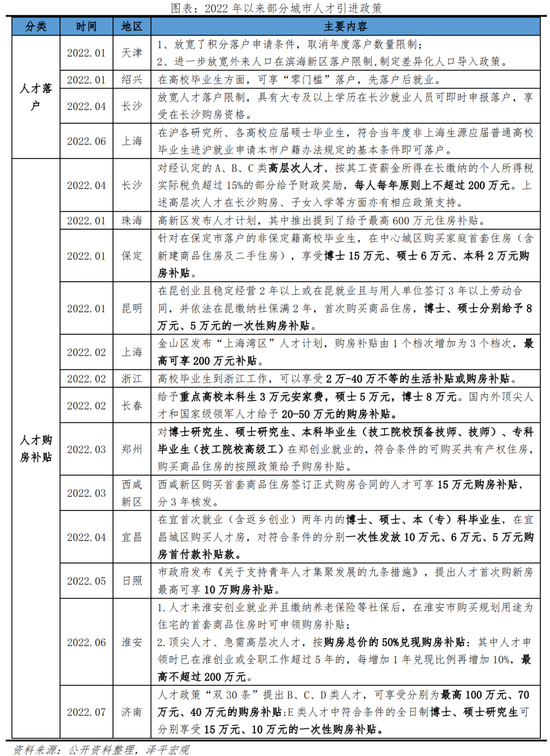 人口是一切经济社会活动的基础、人才更是第一资源。根据我们与智联招聘联合推出的《中国城市人才吸引力排名2022》,近年人才仍不断向东部城市集聚,长三角、珠三角城市群人才集聚能力逐渐增加。分区域看,2017-2021年东部地区人才净流入占比从6.2%增至12.9%,得益于雄厚的经济基础和较高的战略定位,人才持续向东部集聚;中部地区人才持续净流出,但2021年净流出占比略有下降;西部和东北地区人才持续净流出,且2021年净流出占比加大。分城市群看,超6成人才流向五大城市群,长三角、珠三角人才持续集聚,2017-2021年人才净流入占比分别从4.6%、2.0%增至7.4%、4.1%;京津冀人才净流出趋势继续放缓,成渝基本平衡,长江中游城市群人才持续净流出。随着人口红利消逝、人才价值日益凸显,如何吸引人才、留住人才并培养人才成为各城市提升综合实力的手段。2017年初以来,各地掀起“抢人大战”,城市人才竞争不断升级,2022年以来各地人才政策不断优化,包括放宽人才落户政策、提供租购房补贴、创业补贴等,逐渐从“抢人”向“抢人才”转变。
