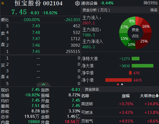 其中,收到证监会立案通知后的首个交易日,恒宝股份一字跌停,报收7.45元/股。