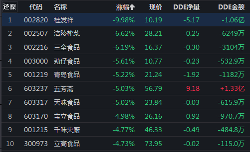食品加工制造板块全线走低,板块下跌2.1%,桂发祥跌停,五芳斋、劲仔食品、千味央厨等跟跌。