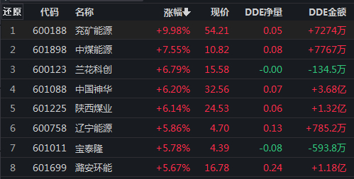 煤炭开采加工板块涨幅居前,兖矿能源盘中涨停创历史新高,中煤能源、兰花科创、宝泰隆、辽宁能源、冀中能源、晋控煤业等跟涨。