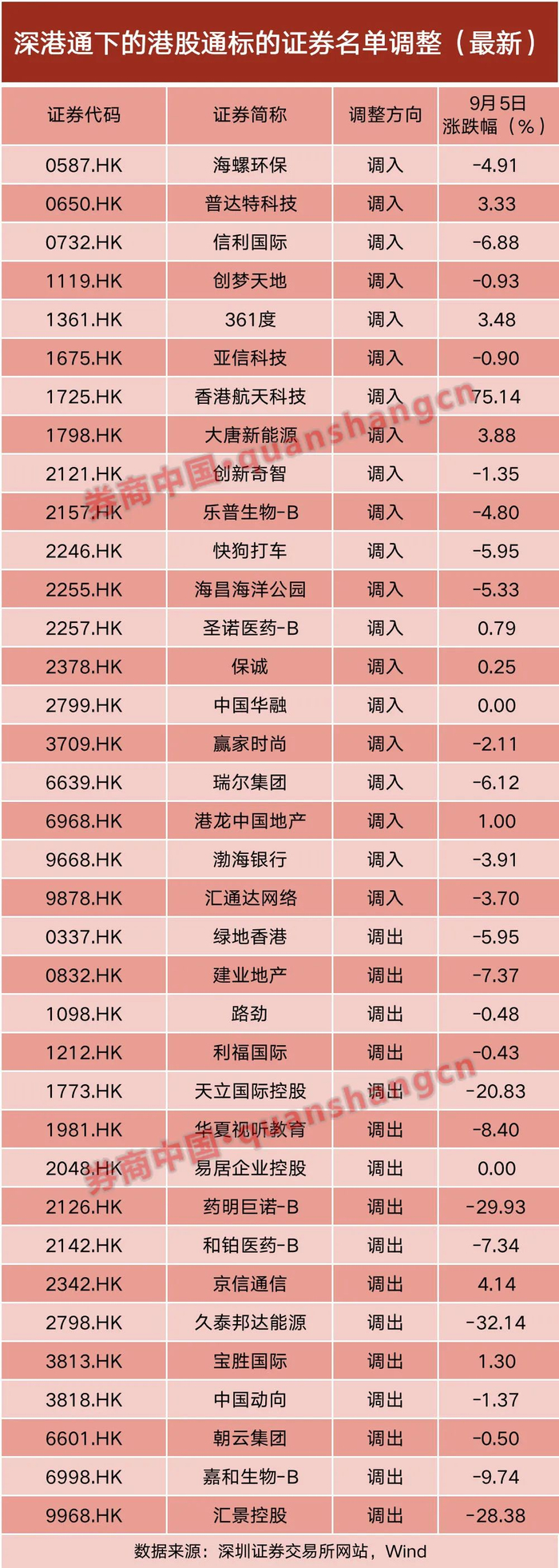 9月5日,深港通下的港股通标的证券名单调整生效。其中海螺环保等20股被调入,绿地香港等16股被调出。