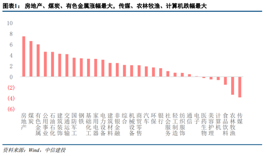 本周市场普遍上涨,上证指数上涨2.37%,深证成指上涨1.5%,创业板指小幅上涨0.6%。在上周的策略周报中,我们指出部分具旺季预期的估值低位板块或有望迎来阶段性轮动性机会。本周的行业分化情况呈现了这一特点:房地产、煤炭、有色金属表现最好,分别上涨7.51%、6.63%和6.02%,传媒、农林牧渔、计算机表现最差,分别下跌3.80%、3.31%和0.57%。从市场风格来看,国证价值指数上涨3.28%,国证成长指数上涨2.07%,大盘指数上涨1.75%,小盘指数上涨1.80%,风格回摆特征较为明显。近期市场特征反映了A股开始修复悲观预期。