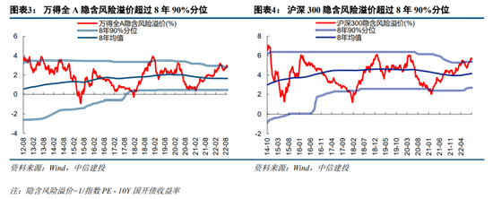 1) A股已经处于较低位置,充分反映了各种悲观预期,目前万得全A和沪深300的隐含风险溢价均超过近8年来90%分位;