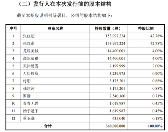 招股书显示,蜜雪冰城成立于2008年4月30日,张红超、张红甫两兄弟为公司控股股东及实际控制人,本次股票发行前,二者合计直接持有公司85.56%的股份,各持股42.78%。目前,张红超为蜜雪冰城董事长,张红甫为公司董事、总经理。蜜雪冰城前五大股东还包括龙珠美城、高瓴蕴祺、天津磐雪,分别持股4%、4%、2%。