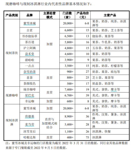招股书显示,根据艾媒咨询报告,2021年度中国现制茶饮行业市场规模为2796亿元,其中“蜜雪冰城”品牌门店2021年度终端销售额约为200亿元,约占现制茶饮行业市场规模的7.15%。此外,根据华经产业研究院报告,2021年我国现制茶饮门店约39万家,“蜜雪冰城”品牌境内门店2021年末数量约2万家,约占现制茶饮门店总数的5.13%。