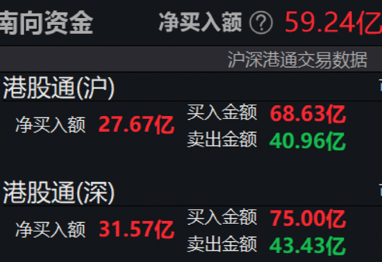 市场大跌之下 ,南向资金再加码,今日合计净买入59.24亿港元,超过9月14日创下的48亿港元高点,为今年6月以来单日净买入峰值。