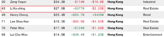 随着股价及资产走跌,李嘉诚的身家也受到影响。据彭博亿万富豪指数,李嘉诚年内资产缩水22.3亿美元(约161亿元人民币),以270亿美元(约2000亿人民币)在香港地区排名列第二。同时,香港不少地产系富豪身家也出现缩水。