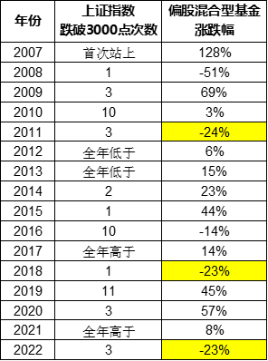 再来看,同样都是年内反复跌破3000点高达10余次的2016年和2019年,偏股混合型基金指数的涨跌幅分别是-14%和45%,相差很大。再往近的说,大家可能感触更深,同样都是跌破3次,今年基金指数下跌-23%,2020年涨幅却高达57%,差距更大。