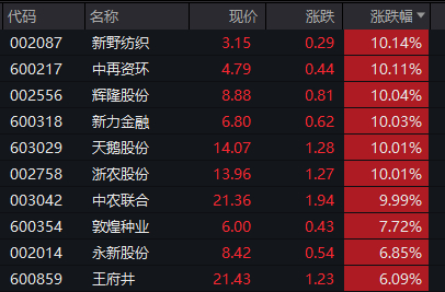 盘面显示,截至1日收盘,新野纺织、中再资环、辉隆股份、新力金融、天鹅股份、浙农股份、中农联合等相关概念股涨停,而天鹅股份、中农联合已收获“两连板”。