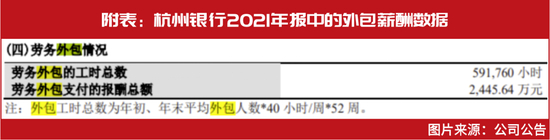 从部分披露了外包员工信息的上市公司财报来看,外包员工和正式员工在薪酬待遇上显然有着较大差距。譬如杭州银行,其是为数不多的公布了劳务外包情况的银行之一。据公司2019~2021年报,每年的劳务外包工时总数分别是84.5万小时、58.1万小时、59.2万小时,对应的年度劳务外包支付的报酬总额分别是5059万元、2785万元、2446万元。从金额上看,杭州银行的劳务外包总额近三年有明显压降。