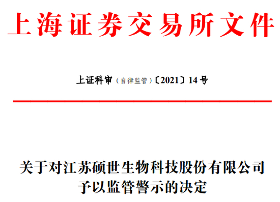 鉴于前述事实和情节,根据《审核规则》第九条、第七十二条、第七十四条和《上海证券交易所纪律处分和监管措施实施办法》等有关规定,科创板上市审核中心决定采取以下监管措施:对江苏硕世生物科技股份有限公司予以监管警示。当事人应当引以为戒,严格遵守法律、法规和本所业务规则等相关规定,诚实守信、规范运作,保证发行上市申请文件和信息披露的真实、准确、完整。