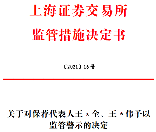 鉴于前述事实和情节,根据《审核规则》第九条、第七十二条、第七十四条和《上海证券交易所纪律处分和监管措施实施办法》等有关规定,本所决定采取以下监管措施:对保荐代表人王*全、王*伟予以监管警示。