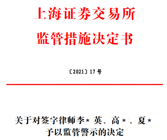 鉴于前述事实和情节,根据《审核规则》第九条、第七十二条、第七十四条和《上海证券交易所纪律处分和监管措施实施办法》等有关规定,本所决定采取以下监管措施:对签字律师李*英、高*、夏*予以监管警示。