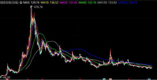 上市后,硕世生物股价一路高歌,半年时间股价涨幅超过2倍,2020年7月盘中股价最高触及476.76元。