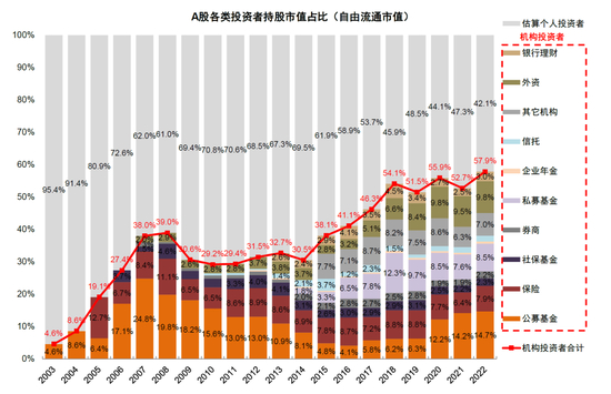 中长线资金与机构投资者占比有望继续提升。推进鼓励中长期资金入市是近年政策引导重要方向。今年2月国务院发布《国务院办公厅关于推动个人养老金发展的意见》,标志个人养老金制度落地,养老基金/养老理财/专属商业养老保险等试点产品亦有序推出。与此同时,伴随资本市场改革等因素,A股机构投资者占比不断提升。2022年在市场整体偏弱势的背景下,A股投资者占比继续提升,我们测算截至2022年6月底,机构投资者在自由流通市值的占比已经提升至57.9%,2023年机构投资者的绝对持股规模和占比仍有进一步提升空间。