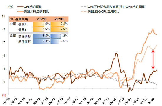 海外“大胀后有大滞”, 但增长放缓并不带来次生危机冲击,滞胀转向衰退的速度和力度对中国市场带来影响。基准情形下,我们认为美国表观和核心通胀均已见顶,之后逐渐回落。在此背景下,美国货币政策紧缩可能在2023上半年迎来拐点,伴随增长预期持续下行。中国汇率和资金流向压力有望逐渐减轻,但是外需将受到全球主要国家经济衰退影响。