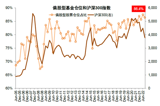 图表32:3Q22主动偏股型基金股票仓位持平略降