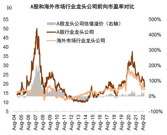 图表49:龙头公司估值方面,今年来海外与A股同步承压,市盈率估值溢价保持在较低水平波动