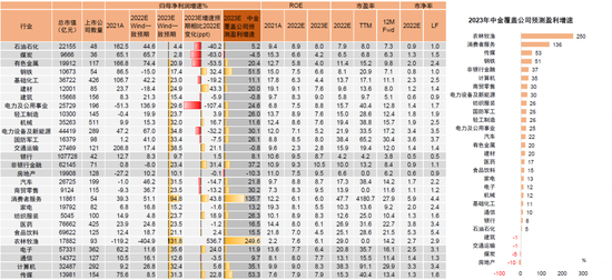 图表12:Wind一致预期/中金2023年各行业一致预期盈利增速