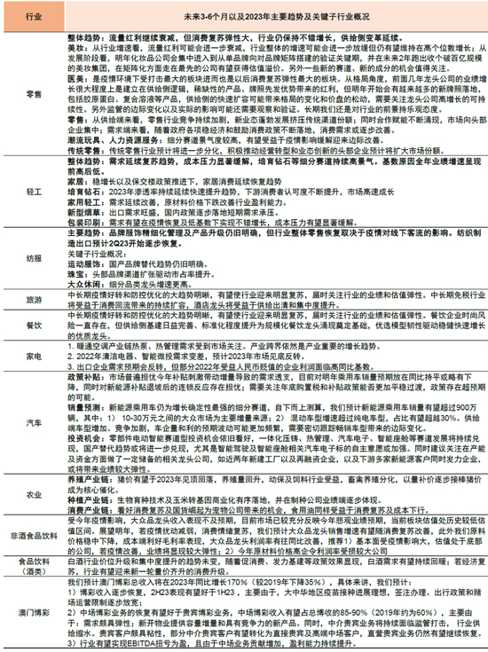 2) 偏消费行业基本面可能逐步改善。2021年以来消费行业基本面回落周期已持续近两年,疫后居民收入增长恢复较慢、消费场景受限、储蓄意愿上升等多重因素影响消费行业需求,叠加地产下行和成本上升,消费行业盈利普遍形成较低的基数。上述因素若部分出现边际改善,居民所积蓄的消费能力有望得到一定程度释放,中金宏观组对2023年社会零售消费增速在两种情形下的预测分别为6.5%和10.0%,均相比2022年增速有所提升,我们预计2023年消费板块盈利增长和盈利能力都有望实现一定程度的改善。