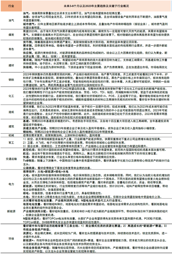 1)跨周期政策与改革:高质量发展,实现中国式现代化。从产业支持方向角度,我们认为安全领域的重视将有系统性提升,注重能源、国防、粮食、科技信息、金融等层面影响;科技创新力度进一步加大,研发投入继续提升,关键技术领域支撑增强,关注产业升级带来的结构性进展;区域均衡发展、共同富裕的机制体制建设进一步完善,关注收入分配以及住房、医疗、养老等社会保障体系的改革进展;绿色发展理念下继续推进碳达峰与碳中和,关注能源革命转型,等等。这是2023年需要关注的结构性趋势。
