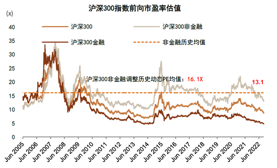 1) 当前A股市场整体估值处于历史低位。截至11月11日,代表蓝筹股的沪深300指数前向12个月市盈率估值从去年年末的11.9倍下降至9.2倍,已经显著低于2005年以来的历史均值12.5倍。其中金融、非金融板块均有下行,金融板块由去年年末的6.0倍下降到当前4.9倍(vs.2005年以来平均估值10.1倍),非金融板块则从去年年末的18.1倍下降到当前的13.6倍(vs.2005年以来平均估值16.1倍)。市净率方面,沪深300指数及金融和非金融部分的前向12个月市净率分别为1.0/0.5/1.6倍。