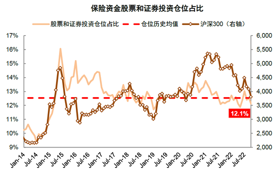 图表39:2022年保险资金股票和证券投资仓位围绕均值水平波动
