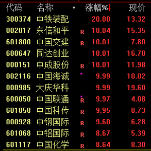 多只中字头类个股盘中集体走高,截至收盘,中国交建、中成股份、中国海诚、中国联通、中国科传等涨停,中铝国际、中国化学涨近9%,中国移动、中国铁建、中国建筑等涨超5%。