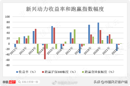 下图是新兴动力的历年收益率和指数比较,我们可以从这张图中得到很多信息。