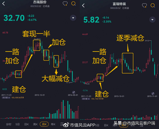 然而,总体来看,这两笔操作都不算成功。杜猛在2家公司的建仓位置很精准,并随着股价大涨一路加仓,在杰瑞股份的股价顶部减持一半仓位,但在回调时再度加仓,在富瑞特装则逐季减仓。