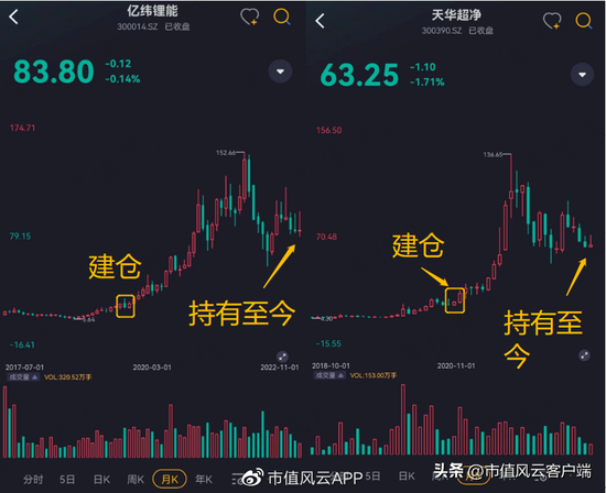 杜猛也非常看好新能源车板块。在2019年Q2以平均约26.6元/股(前复权价)建仓亿纬锂能,在2020年Q4以平均19.9元/股(前复权价)建仓天华超净,2只股票均持有至今,收益早已翻几倍。