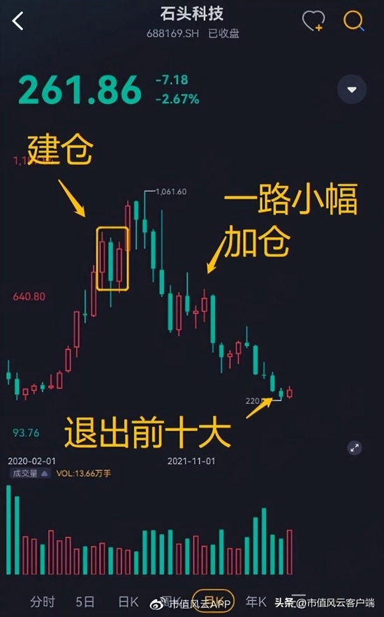 以石头科技为例,杜猛在2021年Q1建仓石头科技,当时股价上涨至1061.6元/股(前复权价),买入后不久便掉头大跌,杜猛一路小幅加仓,最后在2022年Q3扛不住了,石头科技退出前十大重仓股,此时已经从高位暴跌了74%。
