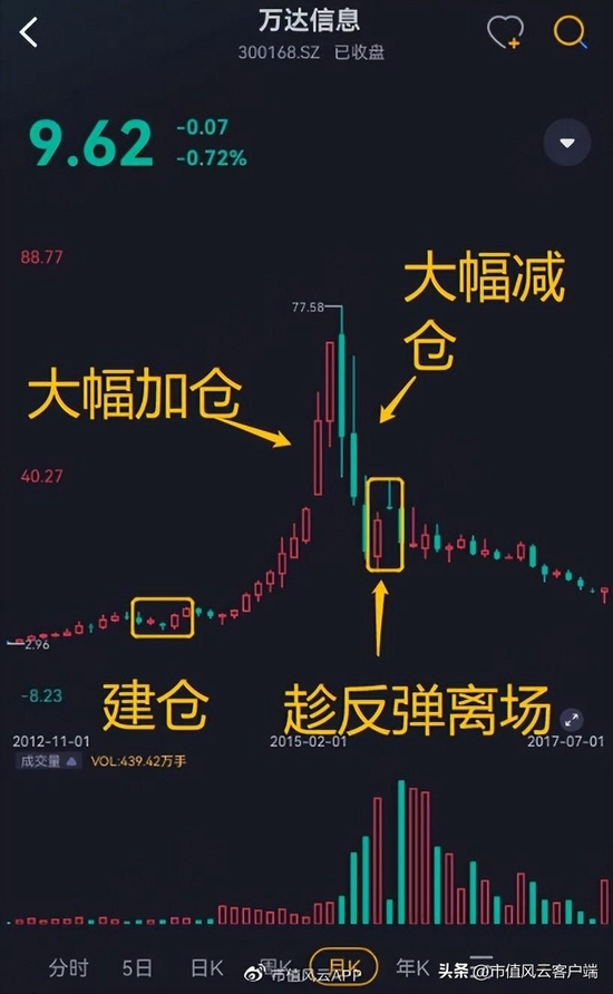 以万达信息为例,当时热炒“互联网+”概念,杜猛在2013年下半年建仓万达信息,在2015年上半年大举加仓,不料遇到股灾,只能在下跌中不断抛售,并在2015年Q4市场反弹时彻底离场。