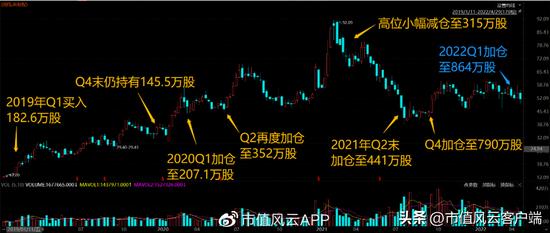 下图为杜猛在牧原股份上的操作,2019年受限于基金规模,一季度加仓后再无大动作。在2020年上半年随着股价上涨再度加仓,在2021年3月的股价高位仍持有315万股。
