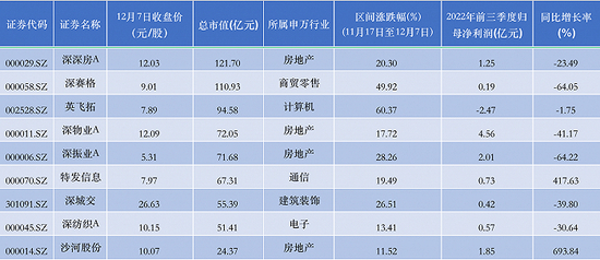 此外,深物业A、特发信息、沙河股份(000014.SZ)的股票自10月中下旬后开始升温,累计涨幅均达到30%以上。
