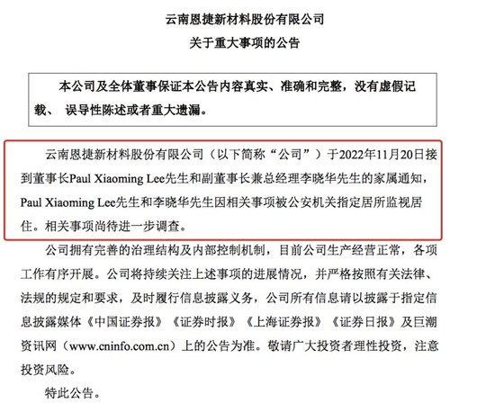 比较例外的是恩捷股份,被查事由相对含糊。11月21日晚,千亿锂电池隔膜龙头恩捷股份发布公告,公司接到董事长Paul Xiaoming Lee(李晓明)和副董事长兼总经理李晓华的家属通知,Paul Xiaoming Lee和李晓华因相关事项被公安机关指定居所监视居住。有媒体报道称,李晓明被查或涉及4年前一起收购。